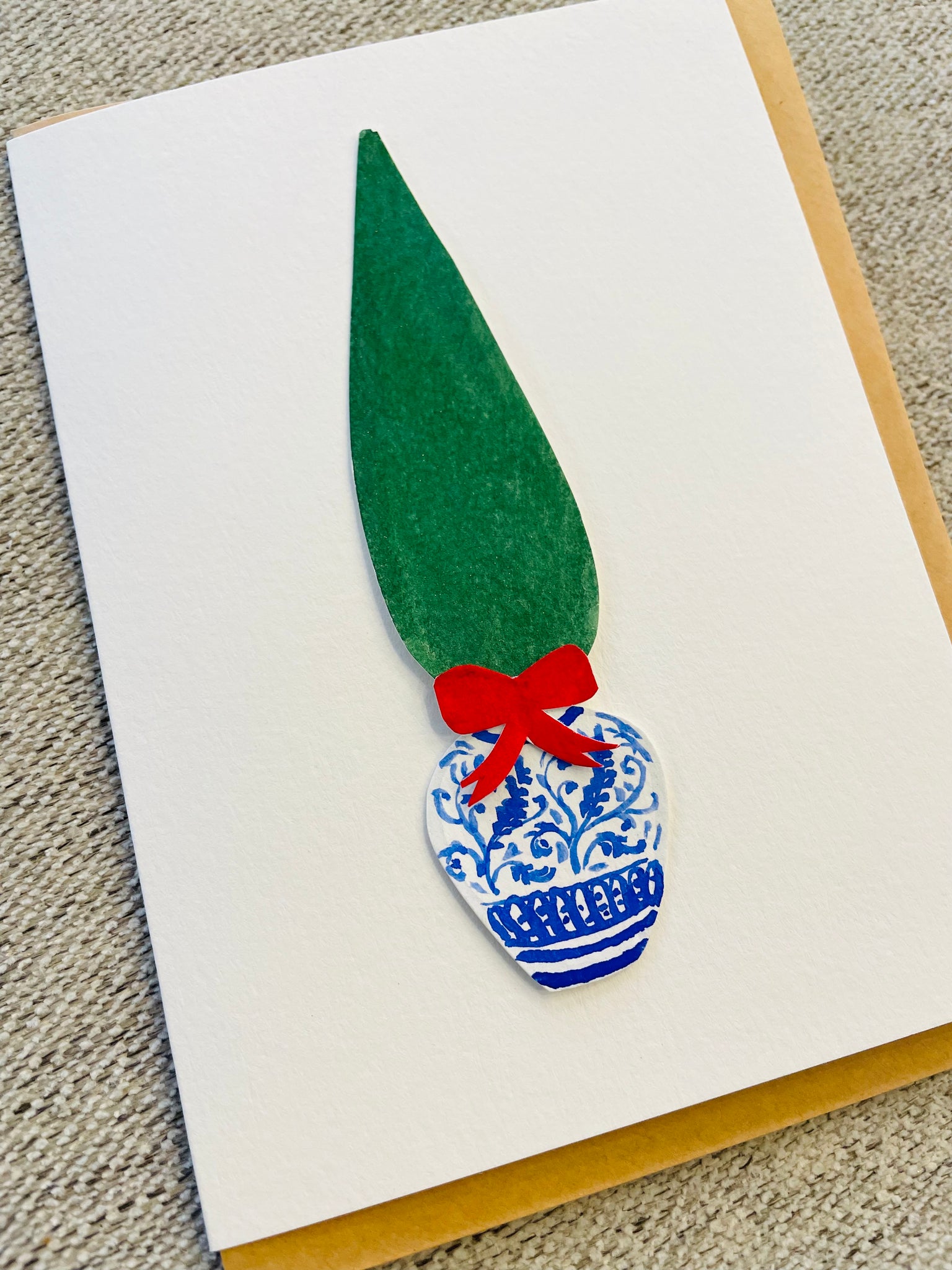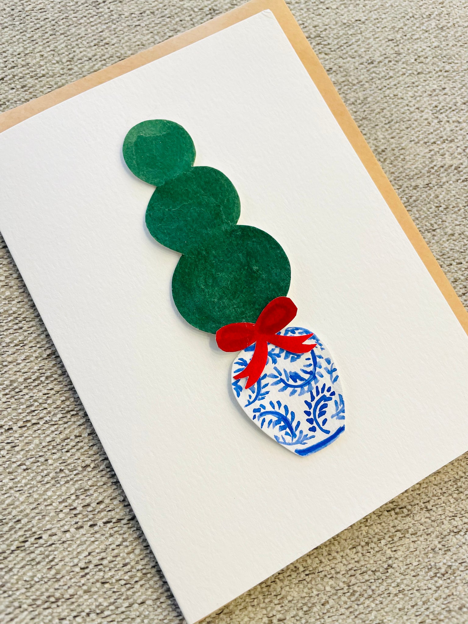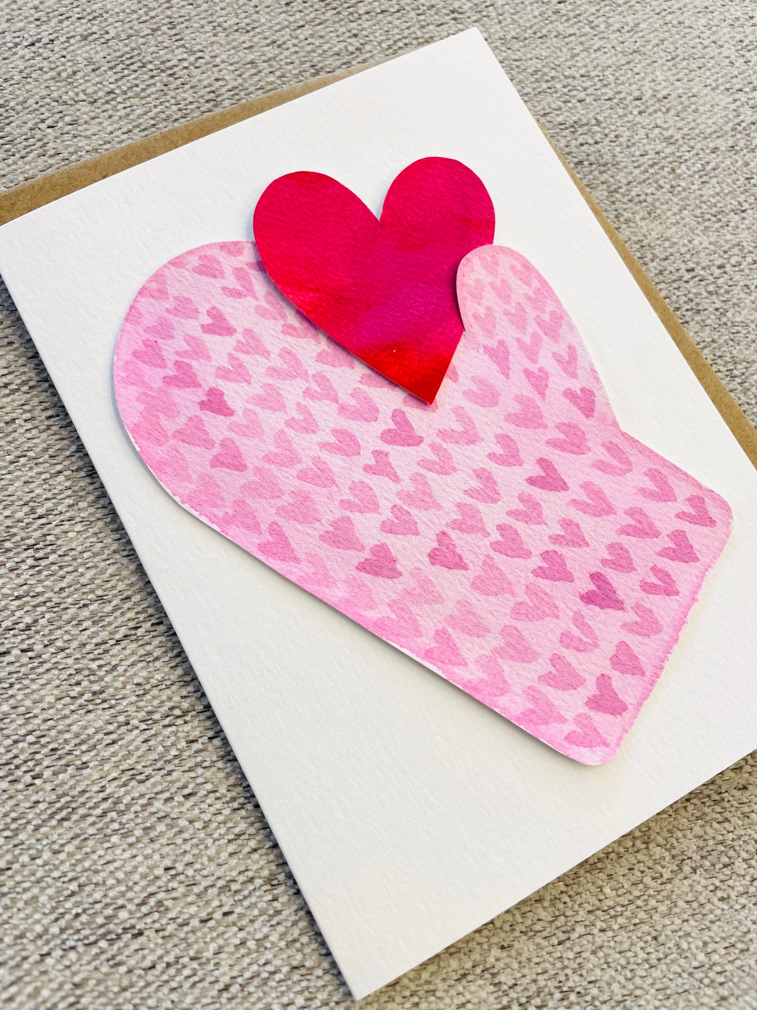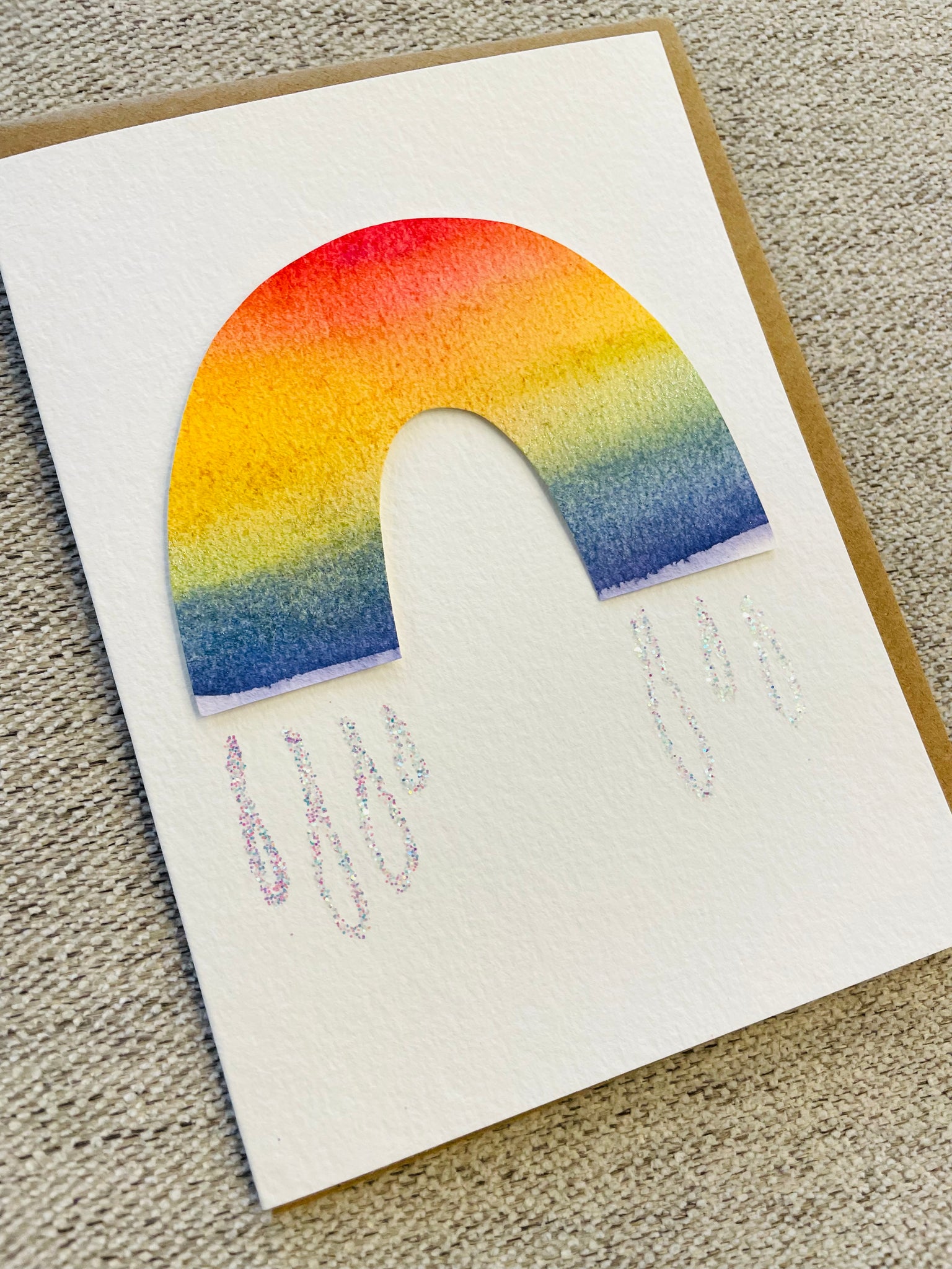Each card is meticulously constructed using cut out pieces of handpainted components that are collaged to create a semi-dimensional effect. The painted pieces are made using Beam Paints watercolors. Some cards come embellished with glitter, rhinestones, or lettering.